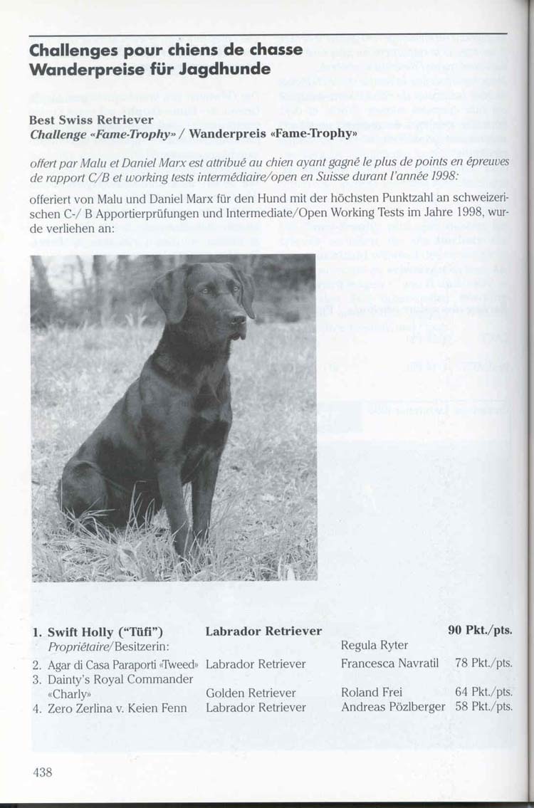 | Prüfungen: | - Winner WT Senioren, Work und Show 2004 - IWT 2002 - Winner WT Open, 1. Work und Show 2001 --> Bild - Winner Fame Trophy 1998 --> Bild - Schweissprüfung TKJ 500m - Apportierprüfung B und C - WT Open - und viele mehr |